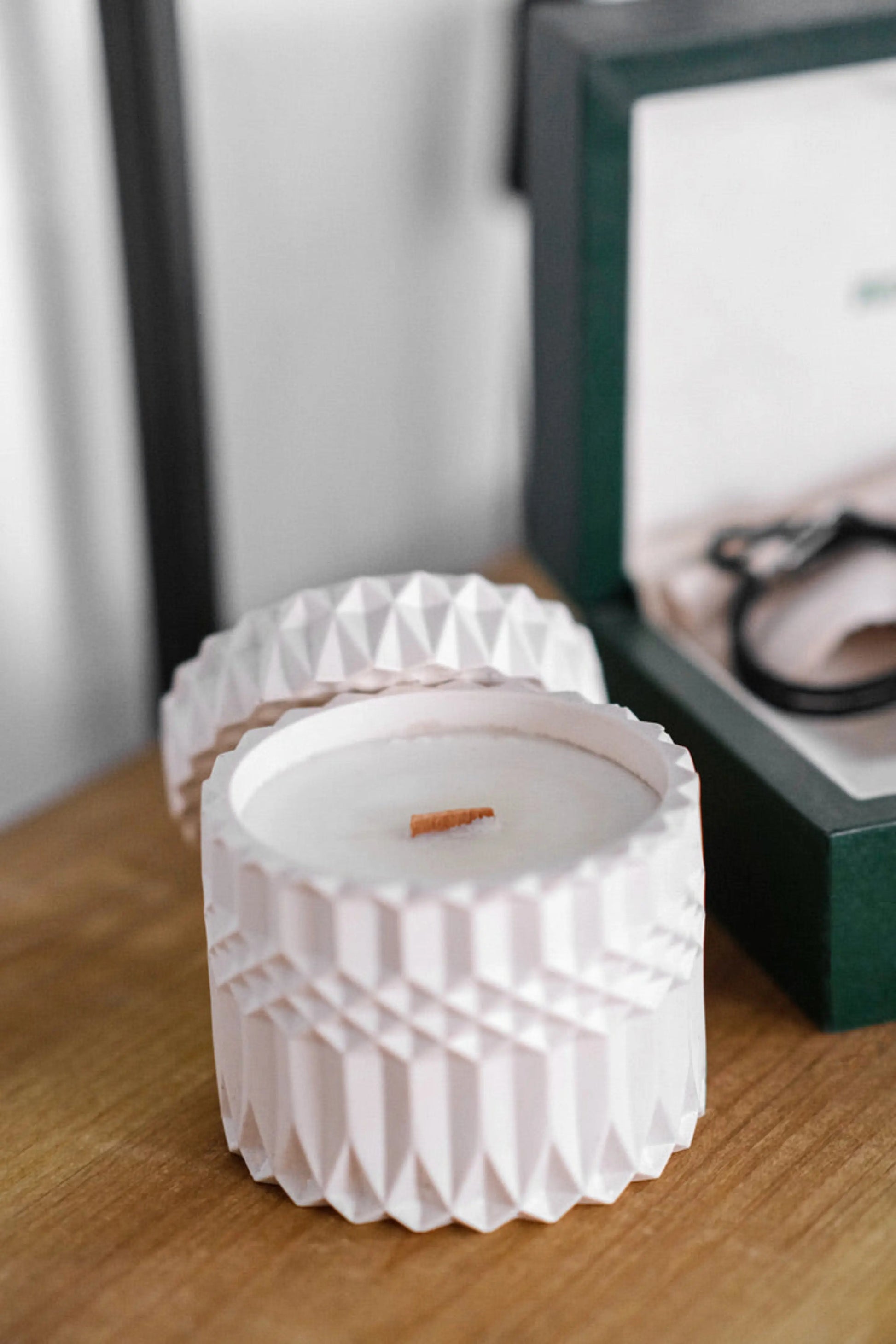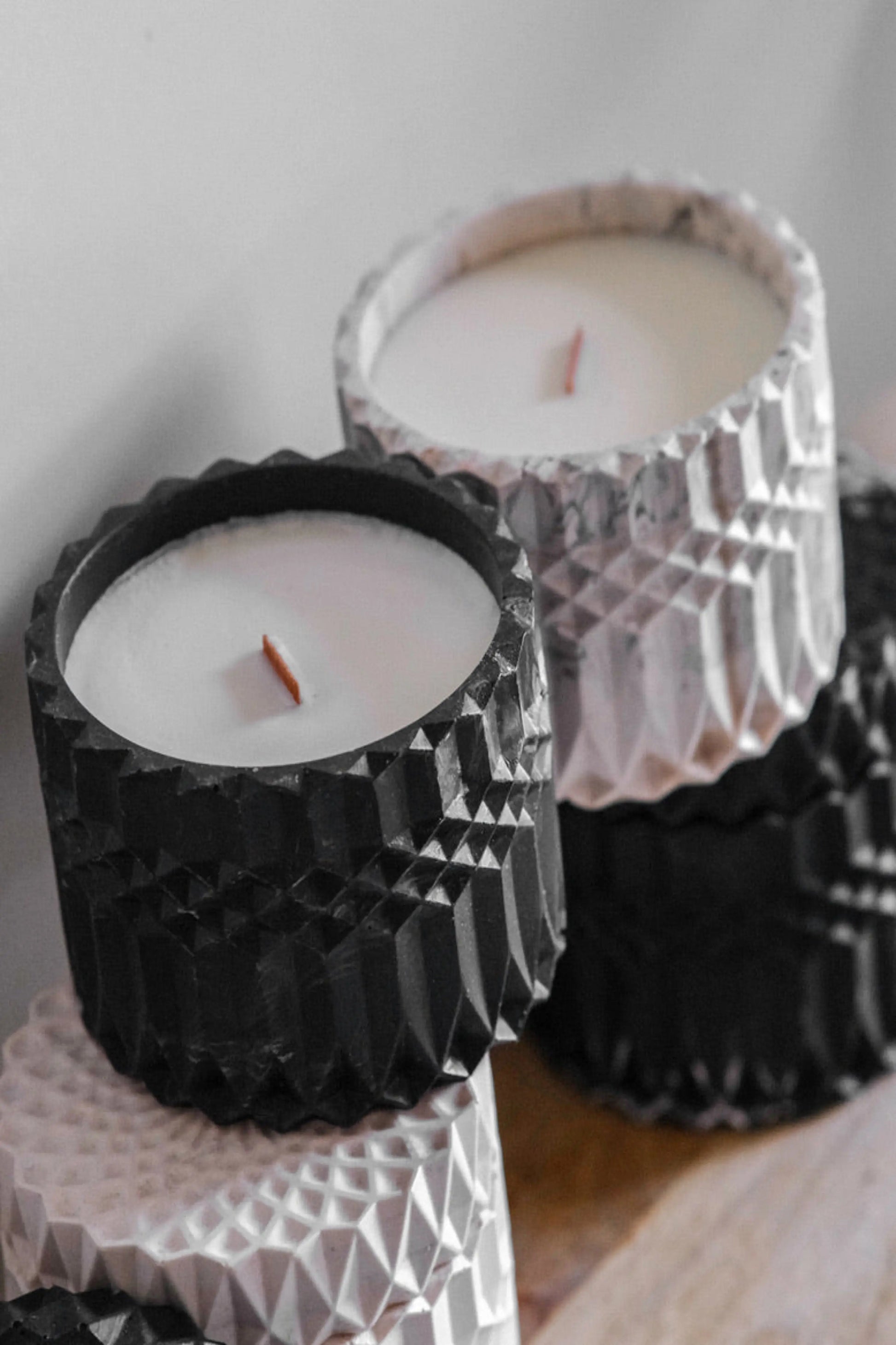 Coulée dans un contenant design et fait main en jesmonite, elle est composée de cire végétale et d'une mèche en bois, alliant esthétisme et écoresponsabilité.